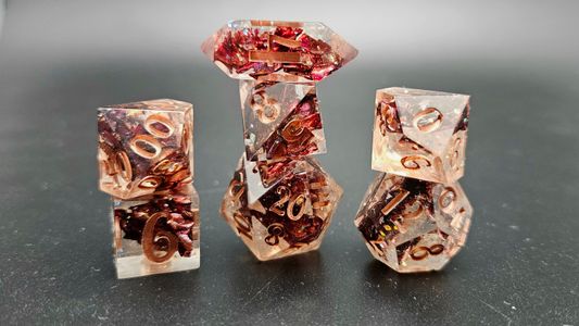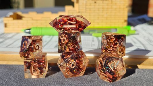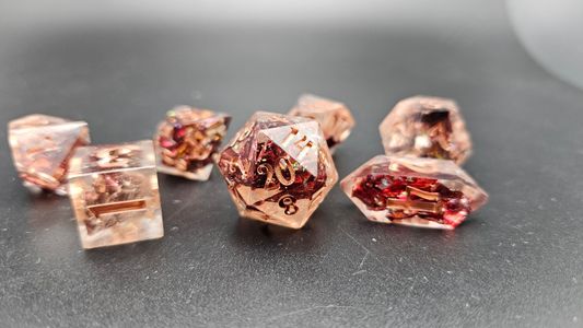 These dice are mostly transparent with light wisps of rose gold smoke surrounding red, gold, green dragon scales with flecks of hyper holo flakes. The "dragon scales" are made from...