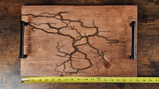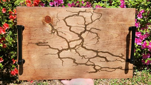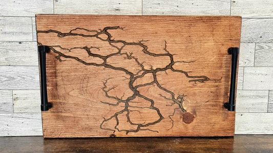 0 savesFractal wood burning is the process through which electricity is used to create free-form designs that are burned into the wood as the electricity passes through it. Once the piece is done, the parts that were burned are cleaned out, and a resin inlay is applied. Then the whole piece is sanded to a uniform finish. All trays are treated with a butcher block treatment, as well as a beeswax and orange oil treatment. All trays can be hand washed. Trays ARE NOT dishwasher safe, and ARE NOT oven safe. It is best not to soak them. The tray itself is made of beech wood and has been stained to achieve this unique, one of a kind look. Please message shop owner with any questions.