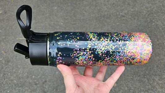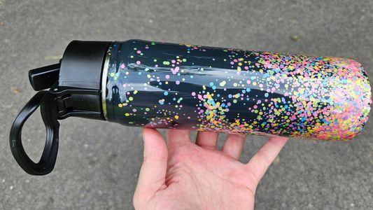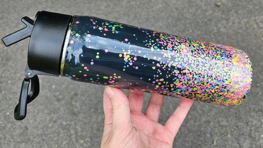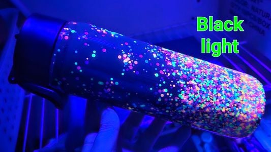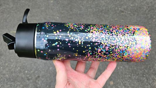 0 savesThis water bottle features a black base with nylon confetti that glows when exposed to black light. This whimsical design is perfect for the cosmic bowling enthusiast, the rave attendant, or any person who delights in a bit of whimsy.