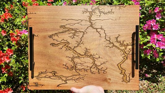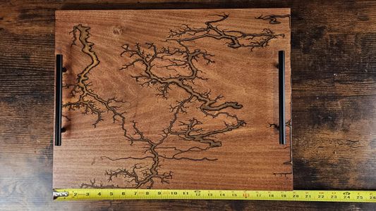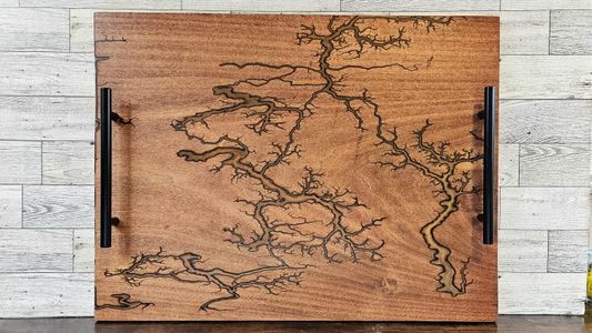 0 savesFractal wood burning is the process through which electricity is used to create free-form designs that are burned into the wood as the electricity passes through it. Once the piece is done, the parts that were burned are cleaned out, and a resin inlay is applied. Then the whole piece is sanded to a uniform finish. All trays are treated with a butcher block treatment, as well as a beeswax and orange oil treatment. All trays can be hand washed. Trays ARE NOT dishwasher safe, and ARE NOT oven safe. It is best not to soak them. The tray itself is made of poplar wood and has been stained to achieve this unique, one of a kind look. Please message shop owner with any questions.