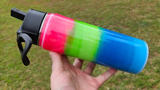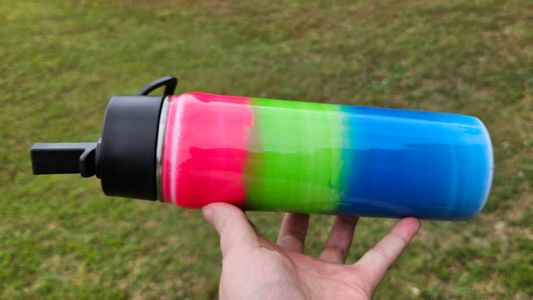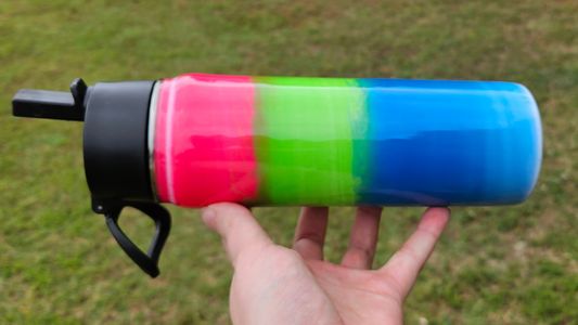 This water bottle is inspired by the polysexual pride flag. While not an exact recreation, the colors are UV and black light reactive for that little bit of extra pizzazz. This 22 ...