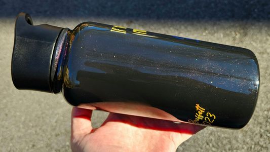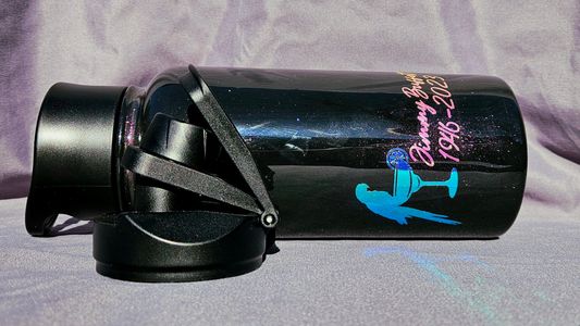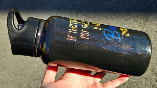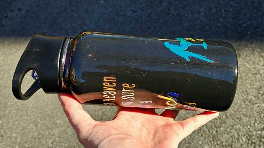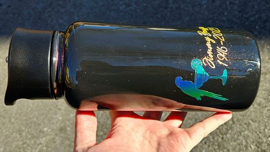 This 32 oz, double-walled, insulated, stainless steel water bottle Comes with two lid options. One lid has a straw attachment, and the second option is an open mouth screw top lid. This water bottle keeps hot drinks hot for up to 24 hours and cold drinks cold for up to 12 hours. All water bottles have a resin top coat to protect the underlying design and our hand wash only.