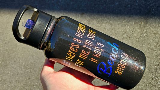 Product details for Heaven is a Beach 32oz water bottle, Jimmy Buffett in memori....