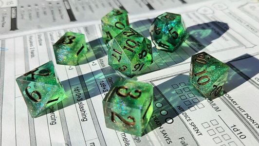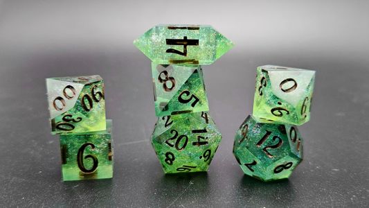 0 savesThese translucent green dice are accented with swirls of color shifting mica flecks and Inked in a deep oak brown. The delicates swirls of color shift give off the mystical energy of this forgotten realm. Use it your own risk. The fey are tricky to their core.