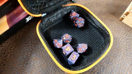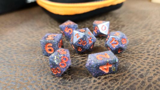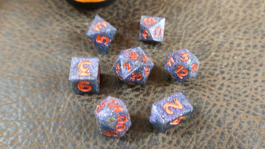 Set of seven dice includes one prism-style d4, one d6, one d8, two d10s (percentile dice), one d12, and one d20s .Colors may vary slightly in person from pictures online. All dice are handmade and hand finished. Minor imperfections may exist, but do not affect usability.