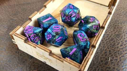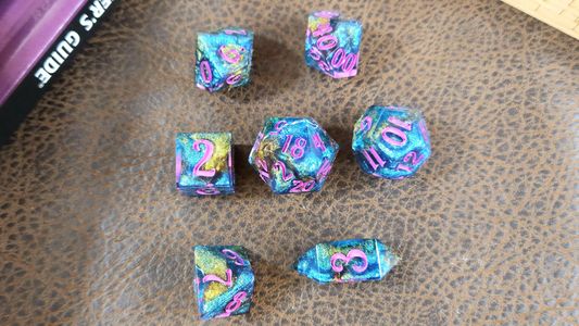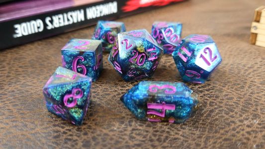 Set of seven dice includes one prism-style d4, one d6, one d8, two d10s (percentile dice), one d12, and one d20s .Colors may vary slightly in person from pictures online. All dice are handmade and hand finished. Minor imperfections may exist, but do not affect usability.
